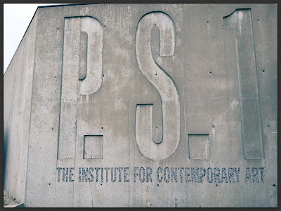 Just a sample of the fun we had on Friday hitting MoMA PS. 1 in Long Island City, Queens. As I've mentioned here before, it's a great little museum with suggested donation rates (bonus points!) that takes less than 10 minutes to drive to (or a few quick stops on the 7 train). So when our friend Monica mentioned she might be going this week, I asked her if she wanted some company and away we went before Nacho had to go to work later that afternoon. The outdoor WALL exhibit was what sparked my interest initially with its hidden pools as cooling stations. As we approached them, however, the security guard came racing over to tell us the kids couldn't walk around up on the decks. Oh joy. This was starting to feel like our disappointing outing in a Chelsea gallery last year. But after a little questioning, he said they could sit and put their feet in as long as they weren't walking around. Perfect. That's all I really wanted anyway. So we attempted to grab some seats from the rad-looking skateboard style planks hanging around when *oops!* Elisa fell in. She slipped just as her feet touched the water and down she went on her butt, soaking her skirt and scaring herself more than anything. As I stifled a laugh and pulled her out, we had barely started to ring out her clothes before Carolina went to move and *oops again!* fell in the water, only this was more like shoulder level on her. Really girls? I take you to an art museum and you have to go swimming first? I mean, in reality, the water was about a foot deep, so I wasn't exactly prepared for them to get soaked. But hey, we rolled with it, changed Carolina into dry shorts and let Elisa run around outside for a few minutes before entering the rest of the museum.